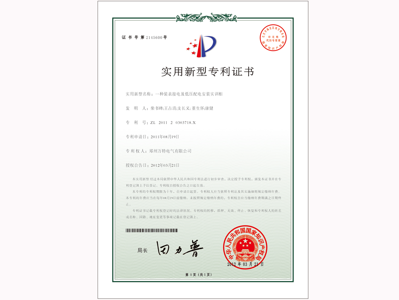 公司實(shí)用新型專利證書(shū)